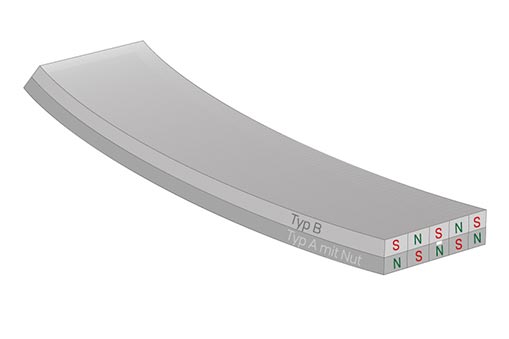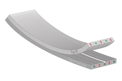 Zur einfacheren Handhabung sind die beiden Bänder unterschiedlich gekennzeichnet: Typ A (Südpol) ist mit einer Nut versehen und ergänzt sich mit Typ B (Nordpol), welcher keine Kennzeichnung trägt. Die entgegengerichtete Polarisierung sorgt für ein deckungsgleiches Übereinanderliegen der Displaybänder. Das ist optimal, um z.B. Displays miteinander zu verbinden.